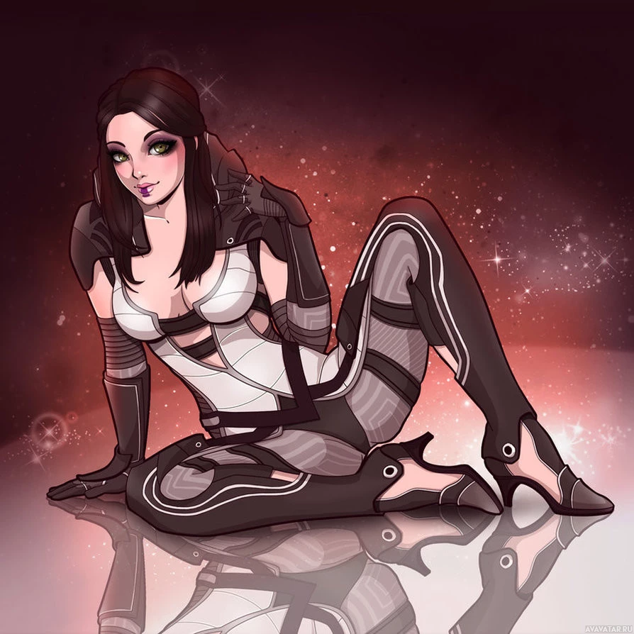 dark hair and green eyes, wearing futuristic armor. She is styled in a way consistent with the Mass Effect video game series, which is known for its