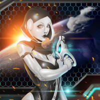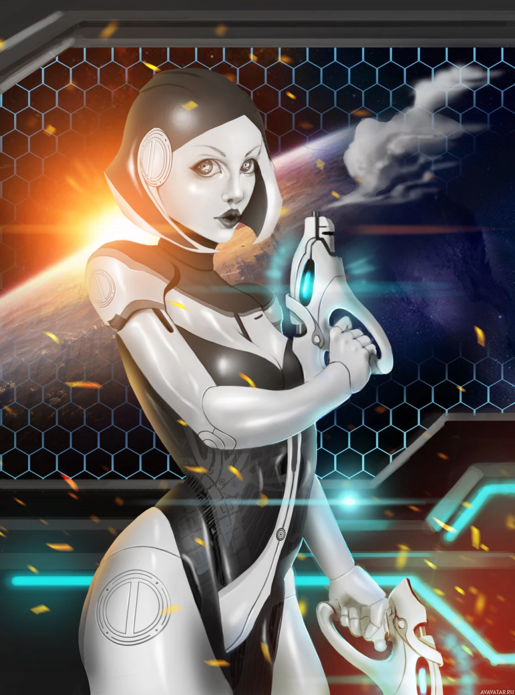 a female character wearing futuristic armor, which is consistent with the Mass Effect series of games. She appears to be EDI (Extended Diplomatic Interactive), an AI character from those games known for her combat capabilities and