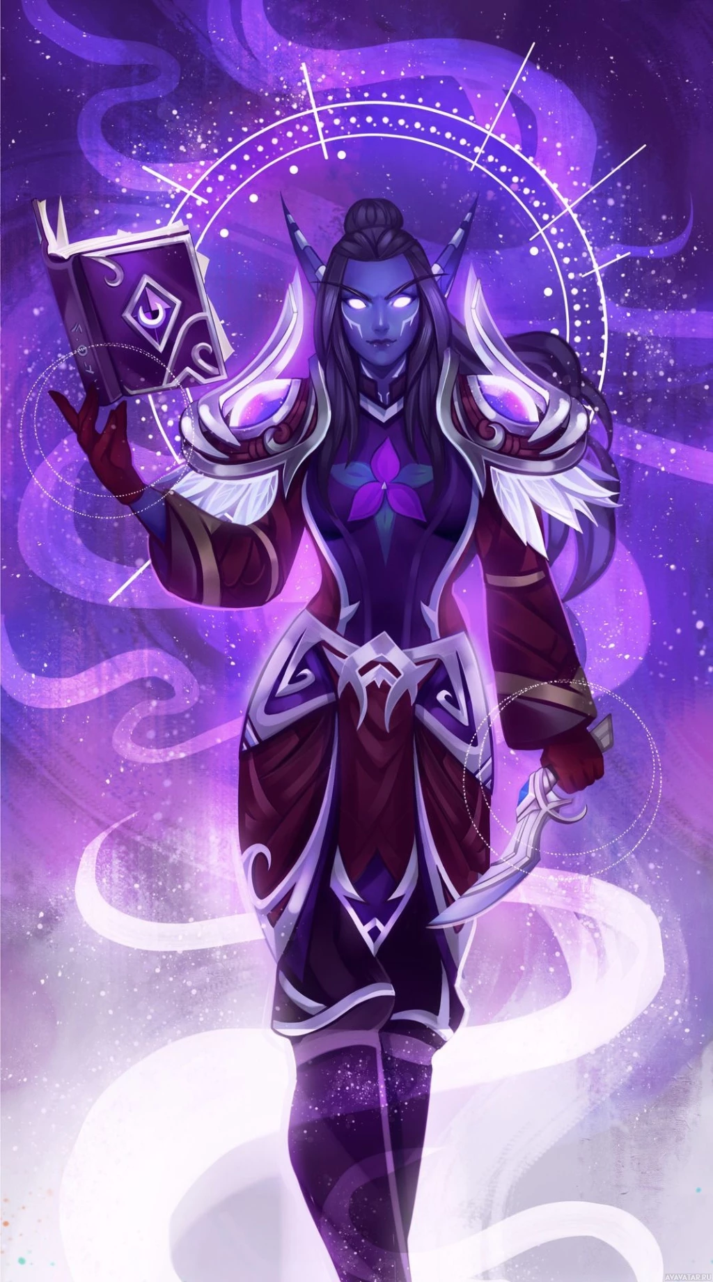 the mystical atmosphere. The character's attire and accessories could indicate their role in a story or game as a warrior or scholar who specializes in arcane matters.