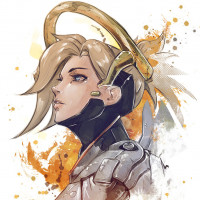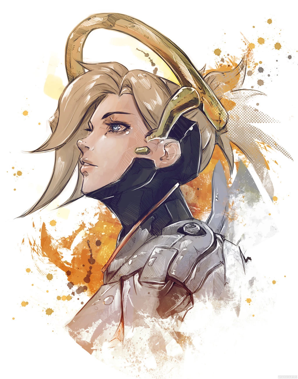 the game Overwatch. She is depicted with blonde hair, wearing her signature angelic wings and healing rifle, which are part of her