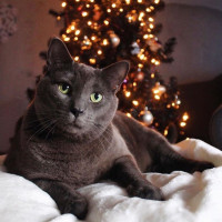 yellow eyes. The cat is resting on what appears to be a fluffy
