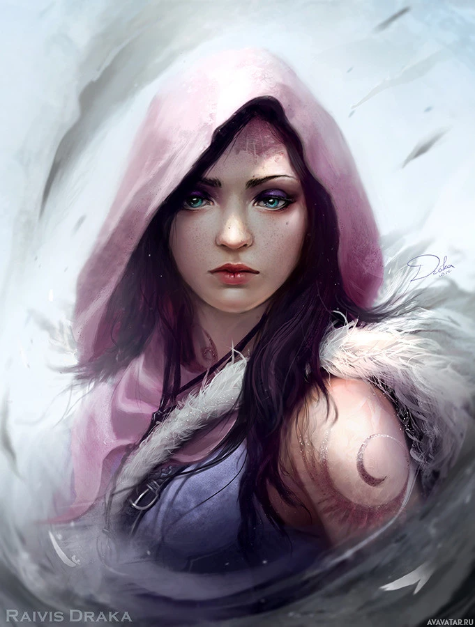 blue eyes and her expression is serious. The background suggests a wintry or snowy environment. There's also some text on the image that reads "Raivis Draka," which could indicate the artist's signature or pseudonym.
