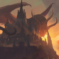 a fantastical scene featuring a castle perched on a mountain, with a massive dragon in the foreground. The castle appears to be under attack or siege by the dragon, as suggested by its position and posture. In the background, there is a silhouette of another creature that could be interpreted as a demonic entity or fantastical monster, adding to