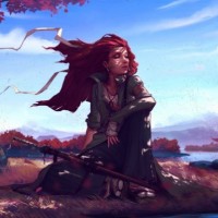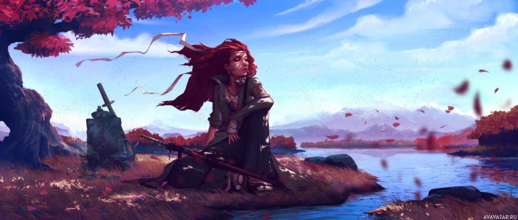 red hair, sitting on a rock by the edge of a body of water. She is dressed in what appears to be fantasy-style clothing, and there are cherry