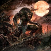 a fantasy scene with a werewolf in the center, surrounded by other wolves. They appear to be in an ominous setting with dark clouds and