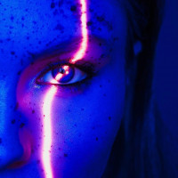futuristic look. There are streaks of red and purple light or paint around her eye and down the side of her nose, creating a striking