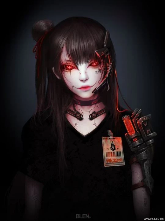 dark hair and is wearing makeup that enhances her cybernetic features, such as red eyes and dark lips. The overall aesthetic suggests a setting where technology and