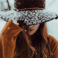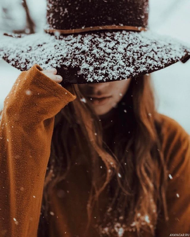 На картинке изображена молодая женщина в коричневой шляпе и гороховом пальто, которая смотрит в сторону с наклоненной головой. Она, кажется, находится в снежной обстановке, о чем свидетельствуют падающие вокруг нее снежинки, и на ее пальто легкая пыль снега. Общее настроение фотографии спокойное и созерцательное.