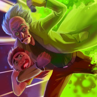 animated characters. On the left is a character known as Rick Sanchez, who appears to be an elderly man with
