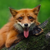 a tree stump. It appears to be looking directly at the camera with its tongue out, possibly panting or yawning. The fox has a vibrant red-brown coat and is surrounded by green vegetation which suggests it might be in