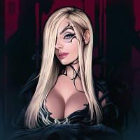 blonde hair and striking blue eyes. She has an unusual design that includes black