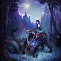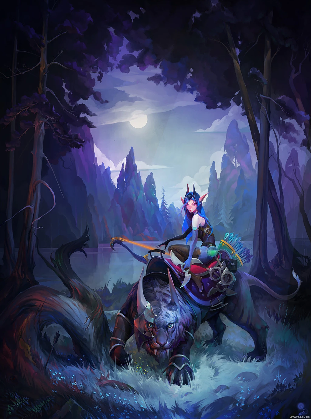 На картинке изображена фантастическая сцена с эльфом, едущим на спине дракона. Они расположены на темном ночном фоне с силуэтами деревьев и полной луной в небе. Эльф держит то, что кажется луком или посохом. Этот тип изображения обычно ассоциируется с фэнтезийными темами или жанрами, которые включают мифических существ, таких как драконы.