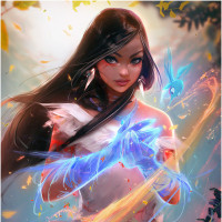 a young woman with dark hair, wearing an armor and holding what seems to be a magical staff or wand. She has a determined expression on her face. There are butterflies and other whimsical elements around her, suggesting