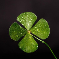 На снимке изображено четырехлистное растение клевера, на котором хорошо видны листья и капли воды. Фон темный и не сфокусированный, что помогает выделить тему фотографии. Этот тип изображения обычно ассоциируется с удачей или ирландскими символами из-за его традиционной ассоциации с празднованием Дня Святого Патрика.