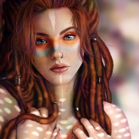 body paint on her skin, suggesting that she may be part of a culture where such markings are common or could be an artist's representation of a fantastical culture. The background is blurred but gives off an ethereal vibe with