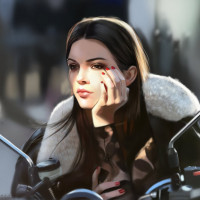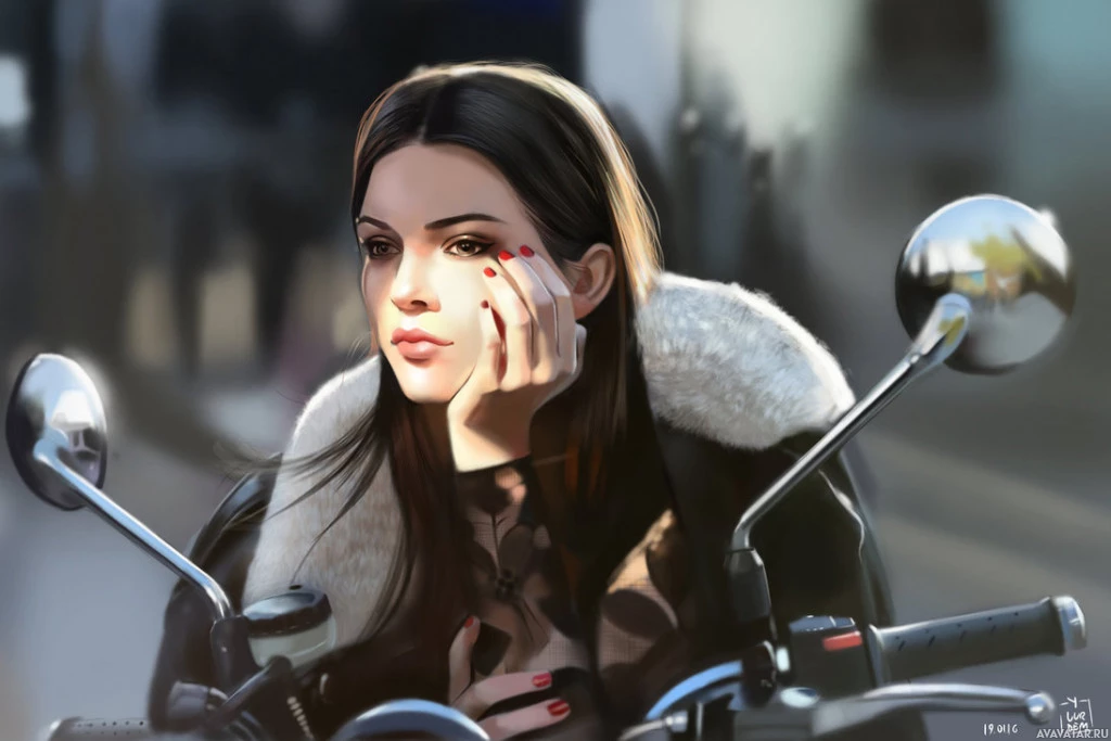 the seat of a motorcycle. She appears to be adjusting her lipstick or makeup. She has long