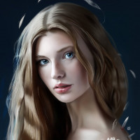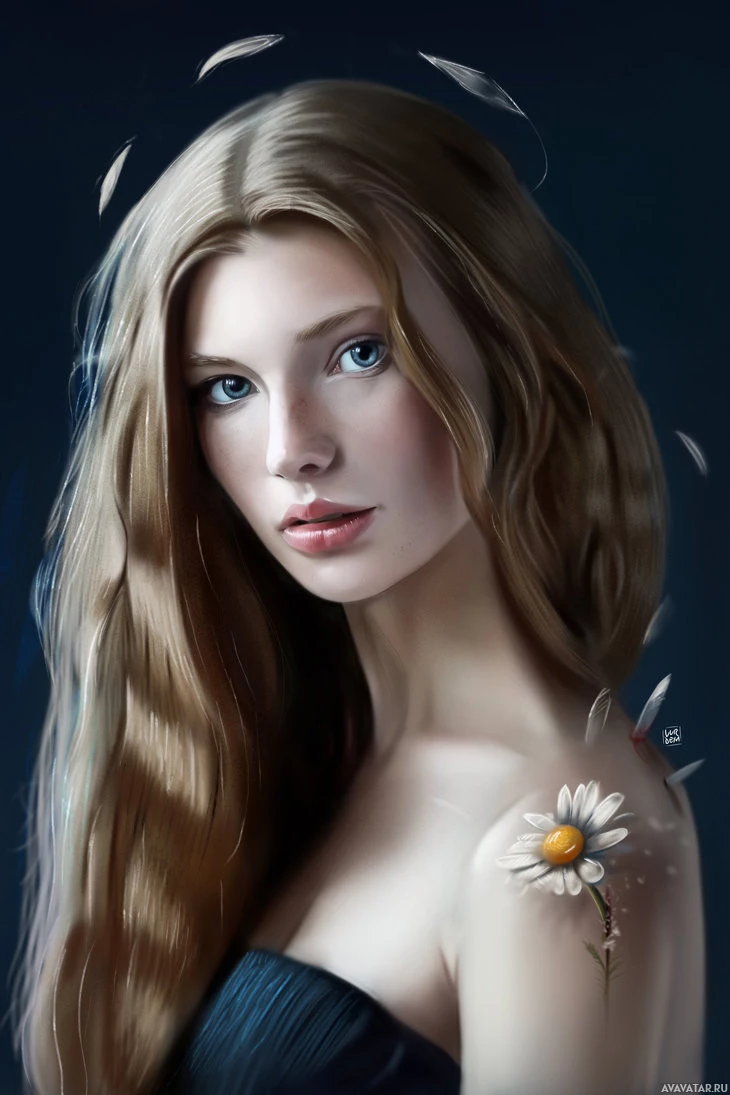 a certain mood or theme; for example, there are feathers floating around her head and what appears to be a daisy on her shoulder, adding to the ethereal or romantic atmosphere of the image. The overall impression is one of beauty and sophistication.