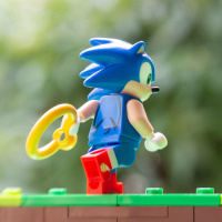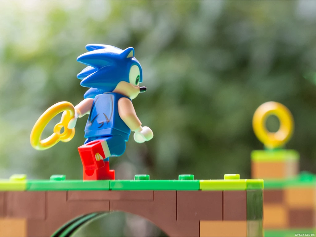The image depicts a Lego figure of Sonic the Hedgehog, an animated character from