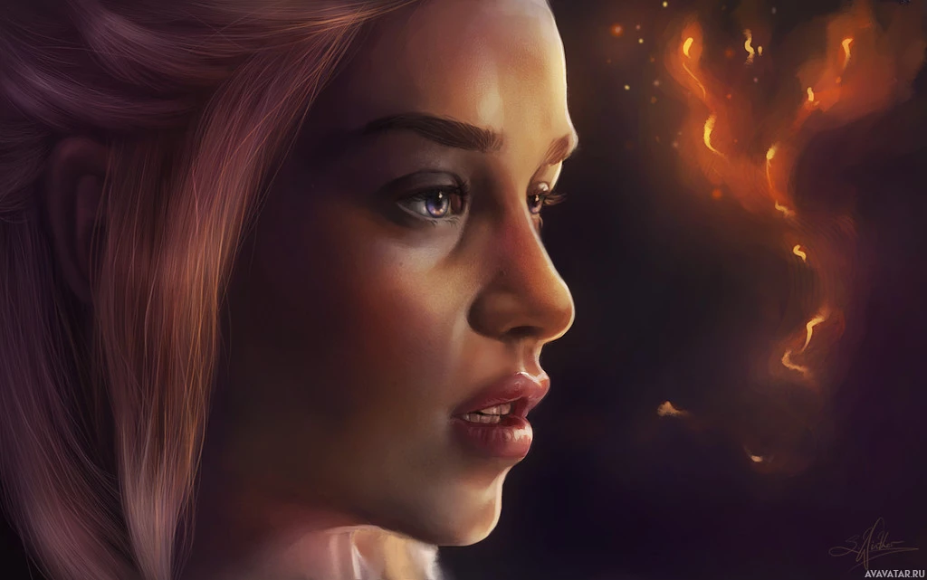 the Mother of Dragons and later as the Queen of Westeros. The artwork captures her with intense eyes and