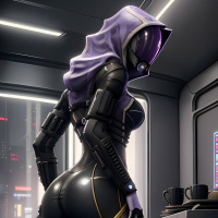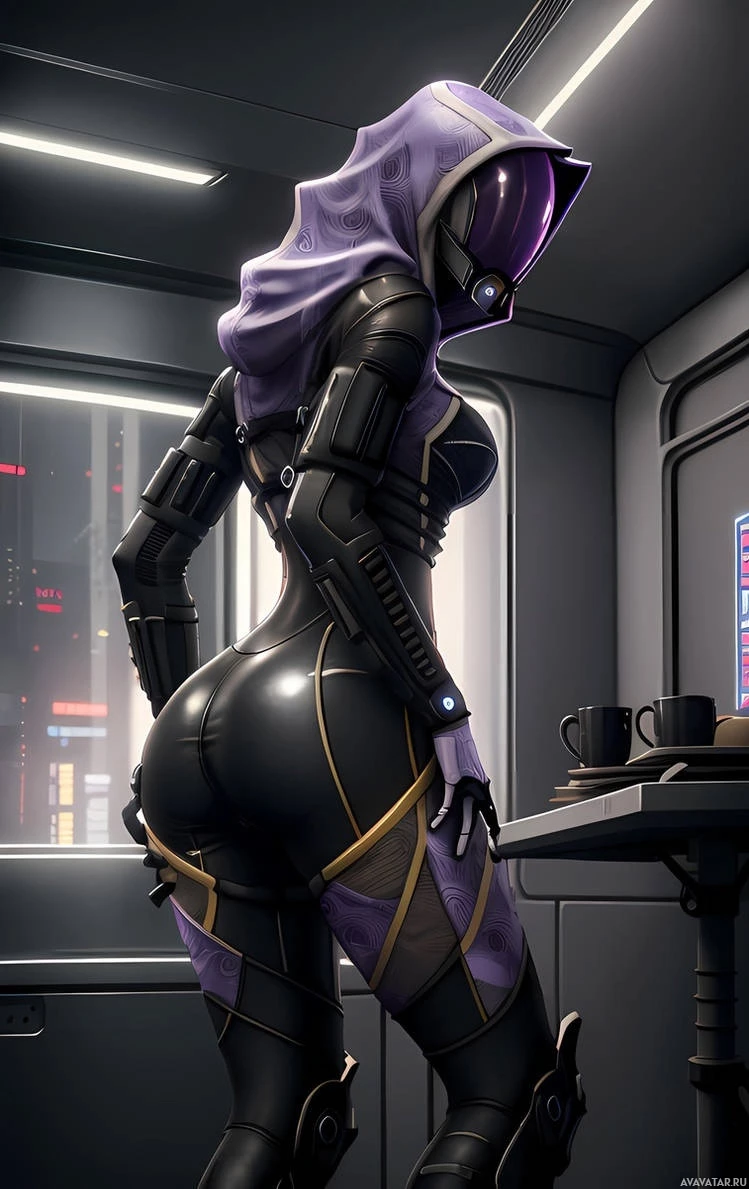 video game series. The character is Tali, known for her distinctive purple armor and helmet with an intricate design that suggests
