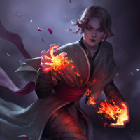 armor pieces. There are flames emanating from her hands, which indicates a power or ability related to