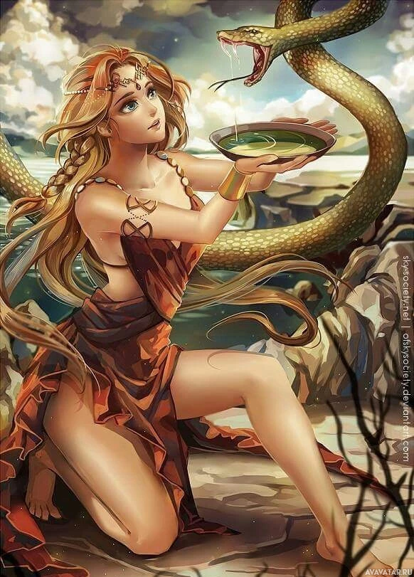 rock formations with a serpent nearby. The character is dressed in a costume that could suggest a mythological or fantasy theme, and she is holding out her hand towards the snake, which is open-mouthed as if it's about to eat something from her hand. The setting appears to be an outdoor environment with some clouds in the sky, contributing to