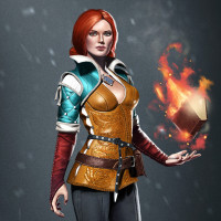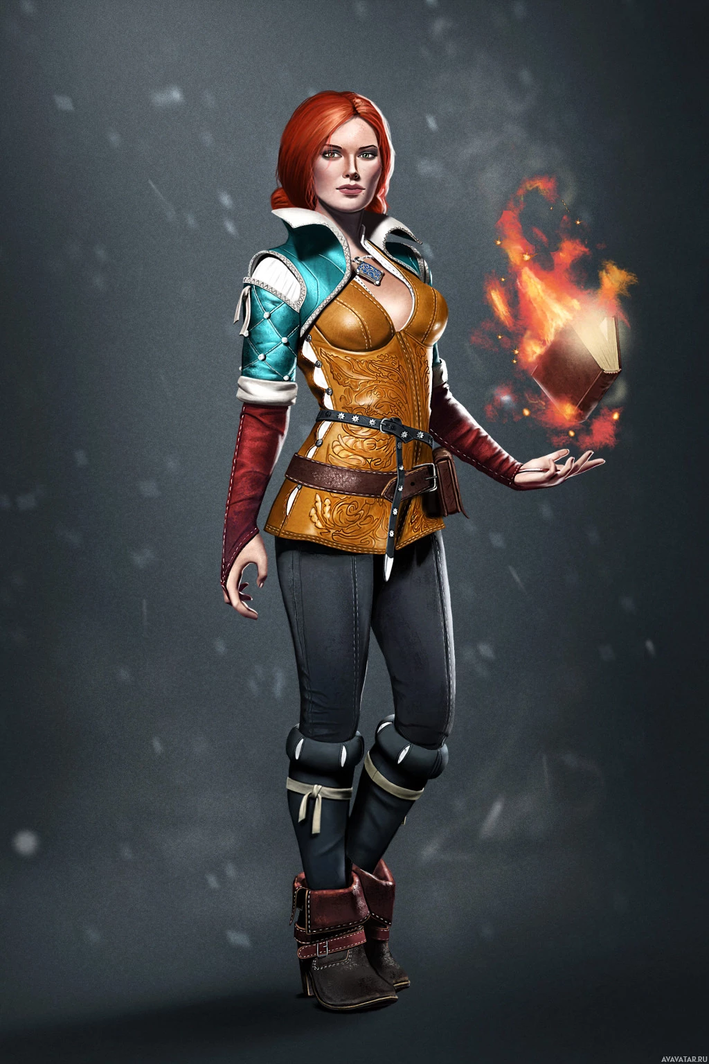 Triss Merigold, one of the main characters in the game. She is depicted wearing a costume that includes armor with a blue and green color scheme, along with boots and gauntlets. She has