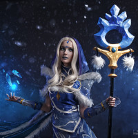 The image depicts a person cosplaying as the character known as Crystal Maiden from