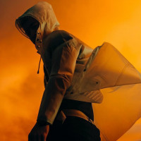 The image depicts a person wearing a hoodie and backpack, standing with their back turned to the viewer. They appear to be looking at something behind them, perhaps observing the sunset or a distant view. The lighting suggests it might be either dawn or dusk due to the warm colors in the sky.