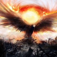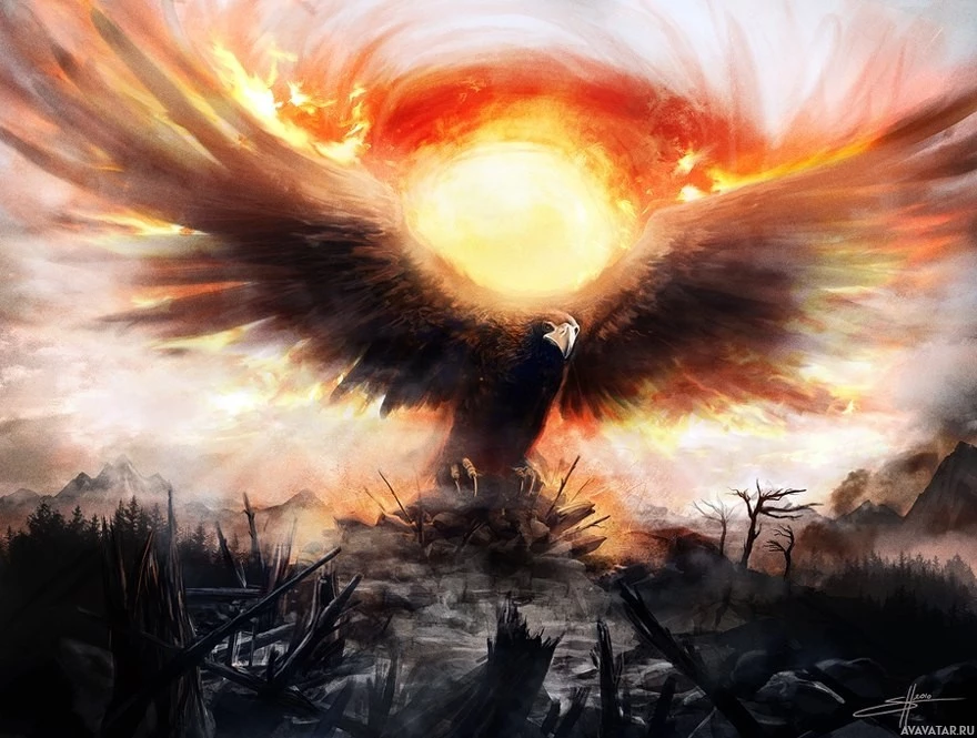 light source in the center behind the bird, which could be interpreted as a sun or fire, giving the impression of rebirth or destruction. This kind of image would likely be associated with