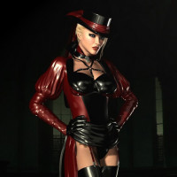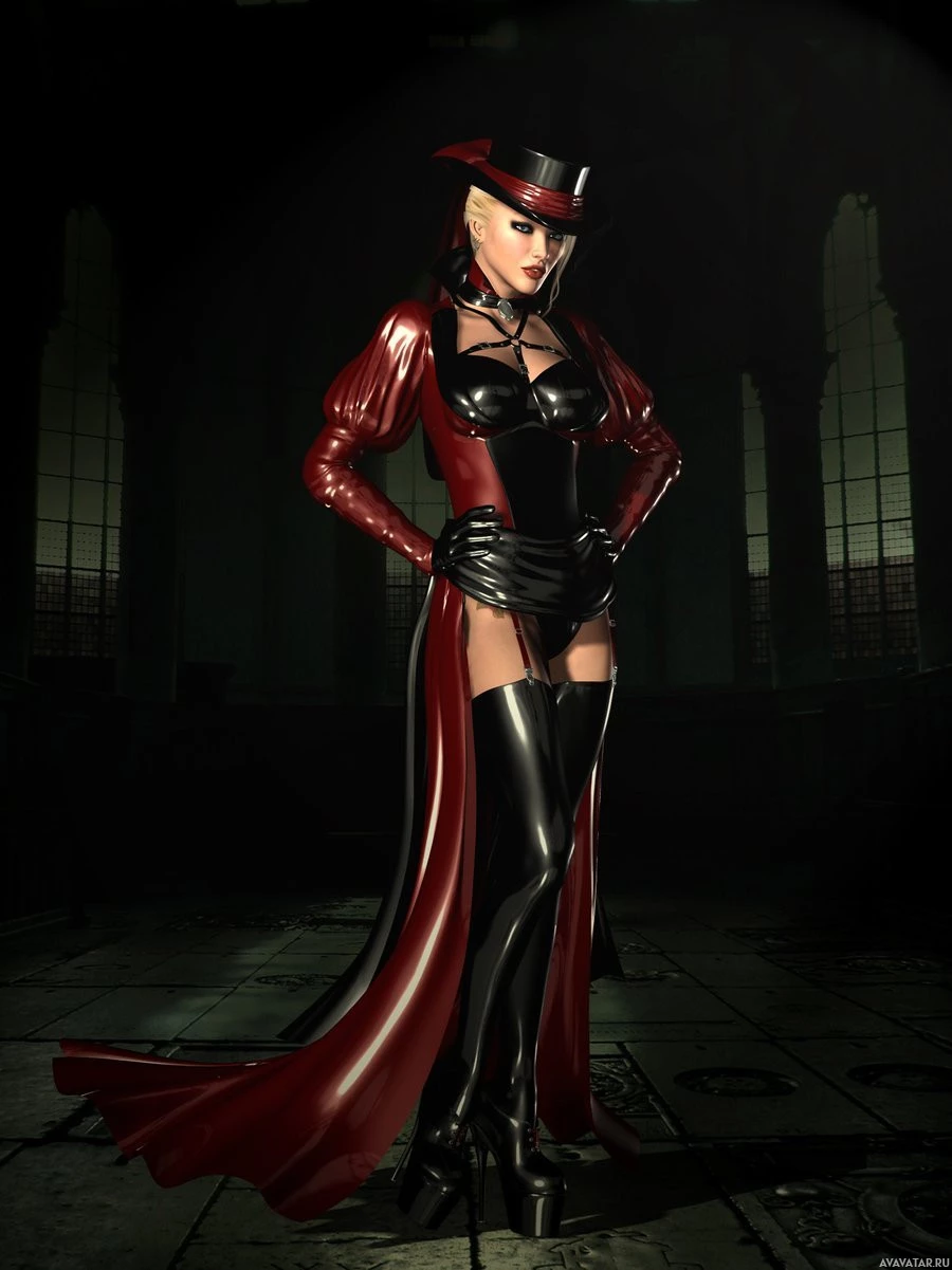 heel boots, and what appears to be a black leather hat or mask with a feather plume. Their pose is confident, and they have
