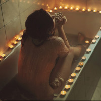 The image shows a person sitting in a bathtub filled with water. The individual appears to be covered in suds or soap, suggesting they might be washing themselves or taking a bath. There are lit candles around the tub, creating a warm and cozy atmosphere. The