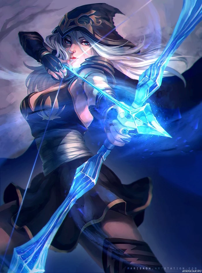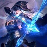 League of Legends." She is depicted with a fantasy theme, dressed in armor and holding a bow with arrows attached. Her attire suggests she might be a warrior or