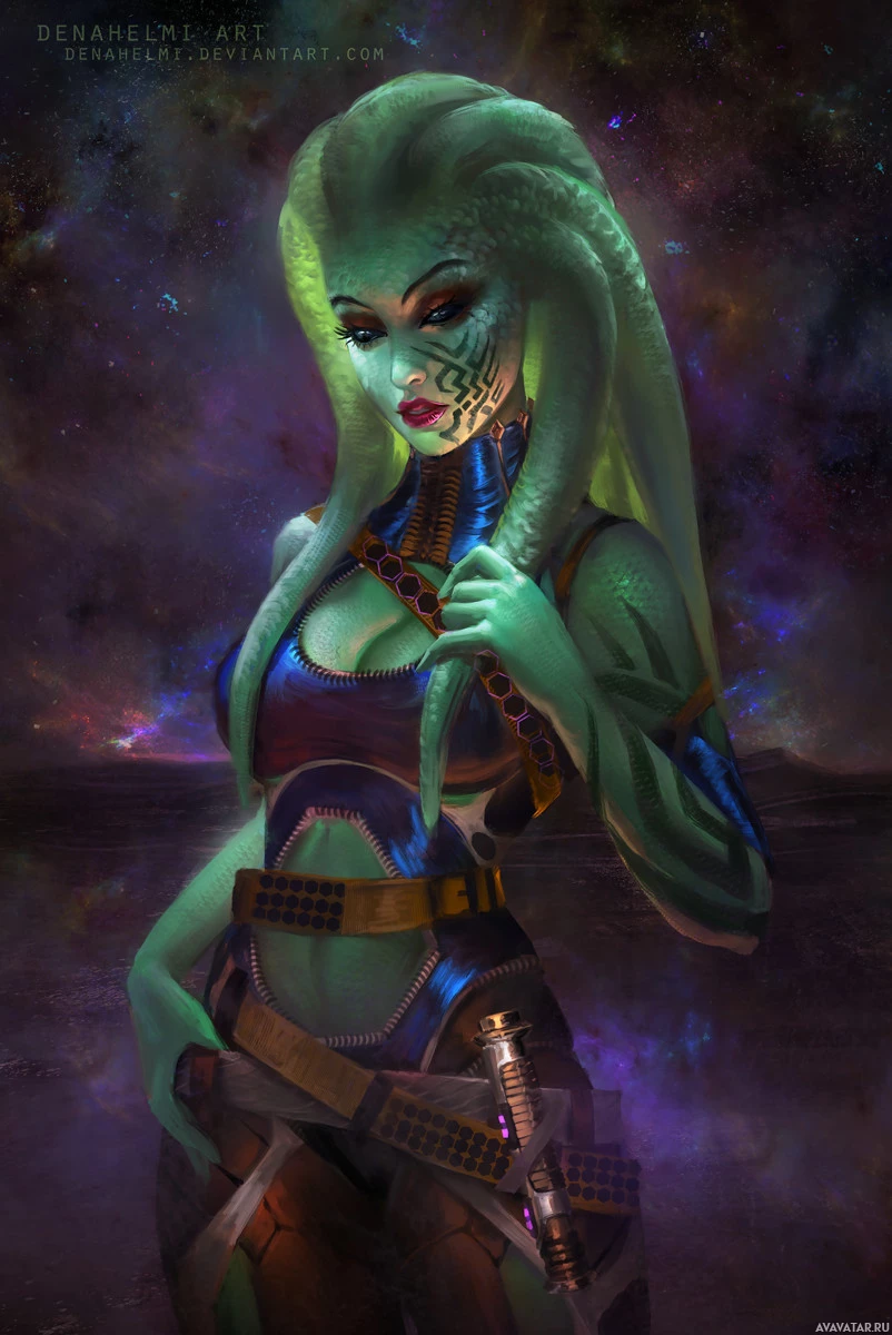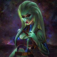 long hair, and is adorned with various accessories that suggest a science fiction or fantasy theme. The background is cosmic in nature, possibly indicating the character's origin or location within a universe where such beings are common.