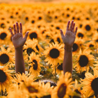 a field of sunflowers. The person's arms are raised, and their hands appear to be in motion as if they are waving or possibly dancing. The background is filled with rows of vibrant