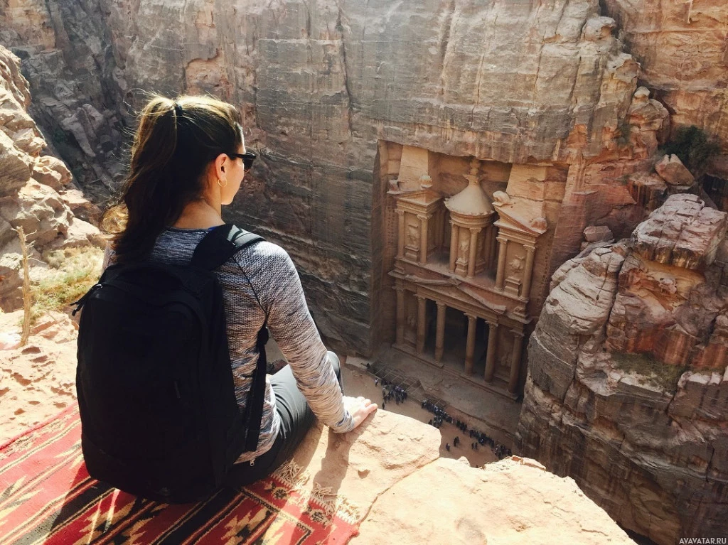 an iconic structure known as the Wadi Rum Monastery, which is part of Petra in Jordan. The setting suggests that she might be enjoying