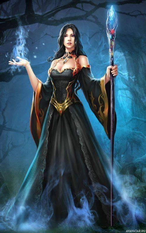 a powerful figure in her universe. She is holding a staff, which often symbolizes magic or authority in such genres. The background has a dark, misty quality, adding to