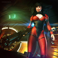 dark hair and red lipstick. She's wearing a red bodysuit with black accents that resemble armor, which includes
