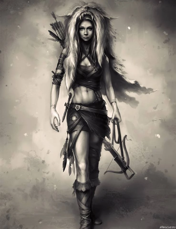 The image depicts a stylized character, reminiscent of a warrior or archer. She is wearing a fur garment that could be indicative of