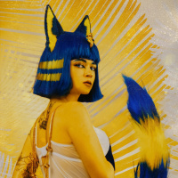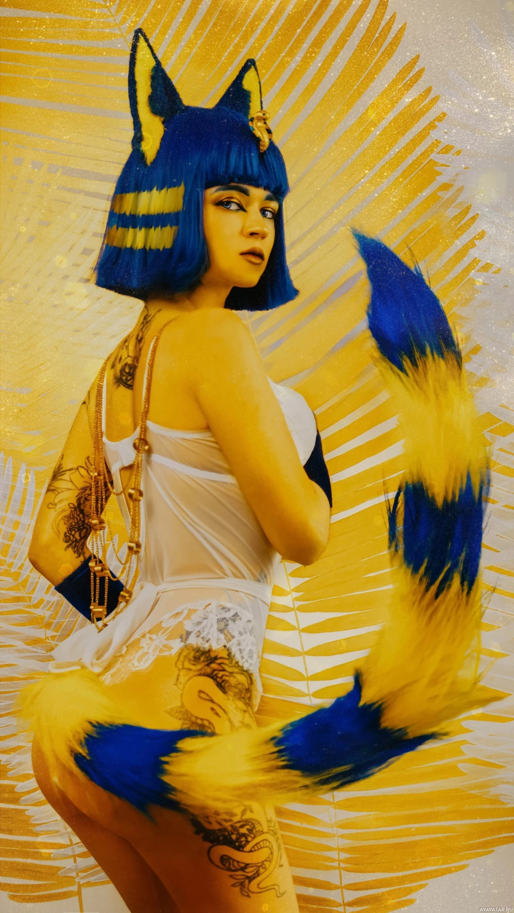 The image features a person dressed in a cosplay costume, emulating the character Ankha from