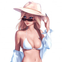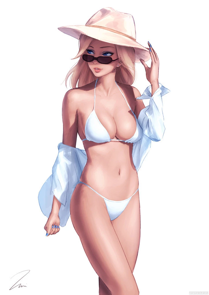 На картинке изображен стилизованный иллюстрированный персонаж, который выглядит как молодая женщина. У нее светлые волосы и она носит солнцезащитные очки. Она одета в купальники с бикини и высокой талией, а также в широкополую шляпу для защиты от солнца. Общий образ дает атмосферу летнего отпуска.