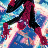 a dynamic pose, swinging through the air. He is wearing his classic red and blue suit with