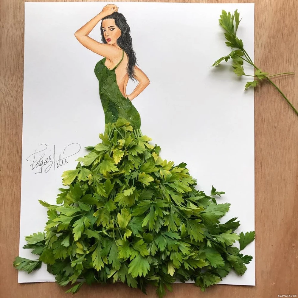 various types of plant material to create the dress. The drawing is detailed and well-executed, capturing the flow of the fabric and
