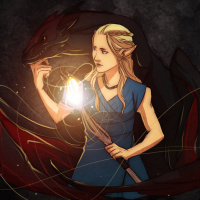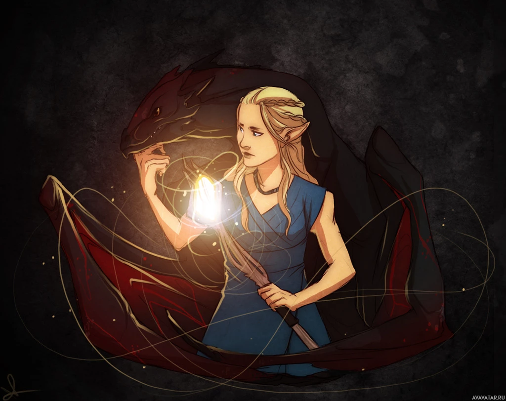 blonde hair, and they are holding what appears to be a staff or wand in their right hand. On the right side of the picture, there is a dragon with