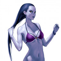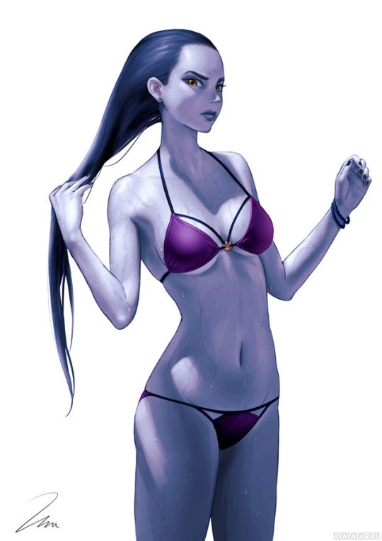 dark hair and is wearing a purple bikini top with black bottoms. The character appears to be from the Overwatch
