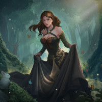 a female character dressed in what appears to be fantasy or fairy tale attire, suggesting she could be from a storybook, a video game, or another form of imaginative media. She is situated in a forest setting with trees and a hint of sunlight filtering through the canopy. There are also some