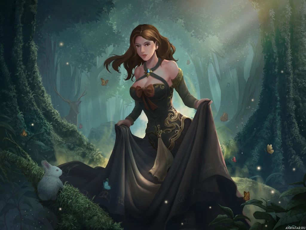 small animals visible, including what looks like a rabbit on her left side. The overall atmosphere is one of mystique and enchantment, fitting for