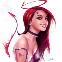 red hair and a smile on her face. She has horns, which is a characteristic of demons in