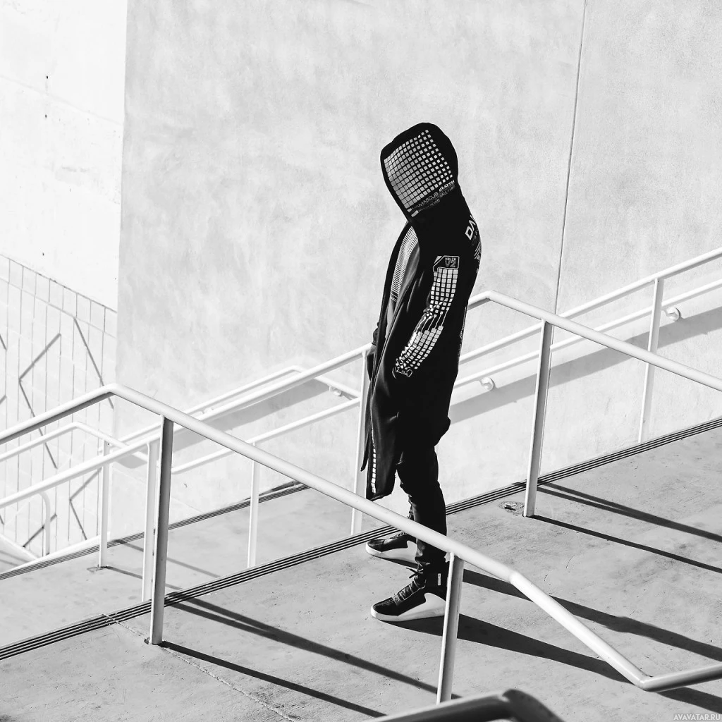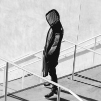 a hooded jacket with the hood up, obscuring their face and head. There is also a mask that covers the lower half of their face. The person appears to be using a walker or cane, suggesting they may have a mobility issue that requires assistance while walking. The background is relatively nondescript, featuring