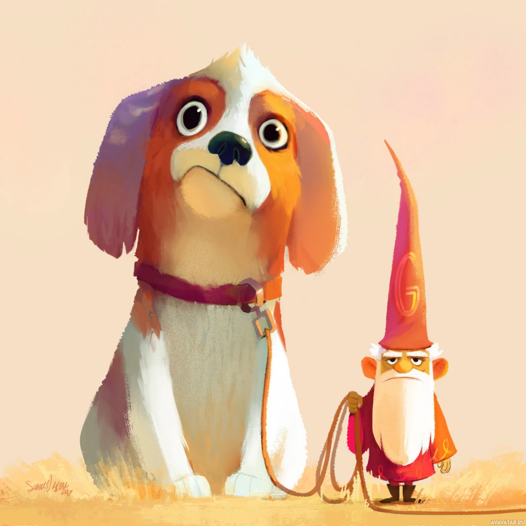 The image depicts an illustration of a dog and a dwarf. The dog appears to be a medium-to-